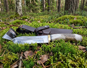 Rokturis veidots no dabīgā raga ar misiņa elementiem, kas piešķir nazim elegantu izskatu un nodrošina ērtu, stabilu satvērienu. Komplektā ietilpst kvalitatīva ādas maksts, kuru var ērti stiprināt pie jostas, lai nazis vienmēr būtu pa rokai.